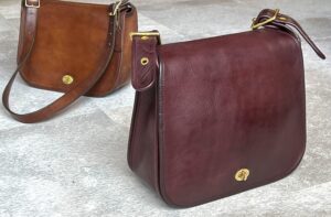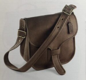 Regulation flight attendant’s shoulder bag with extra large carrying capacity. Handy pocket right under the flap and a zipper compartment inside. The stirrup buckles and the industrial turnlock are solid brass. Brass “feet” protect the bottom from scuffing.