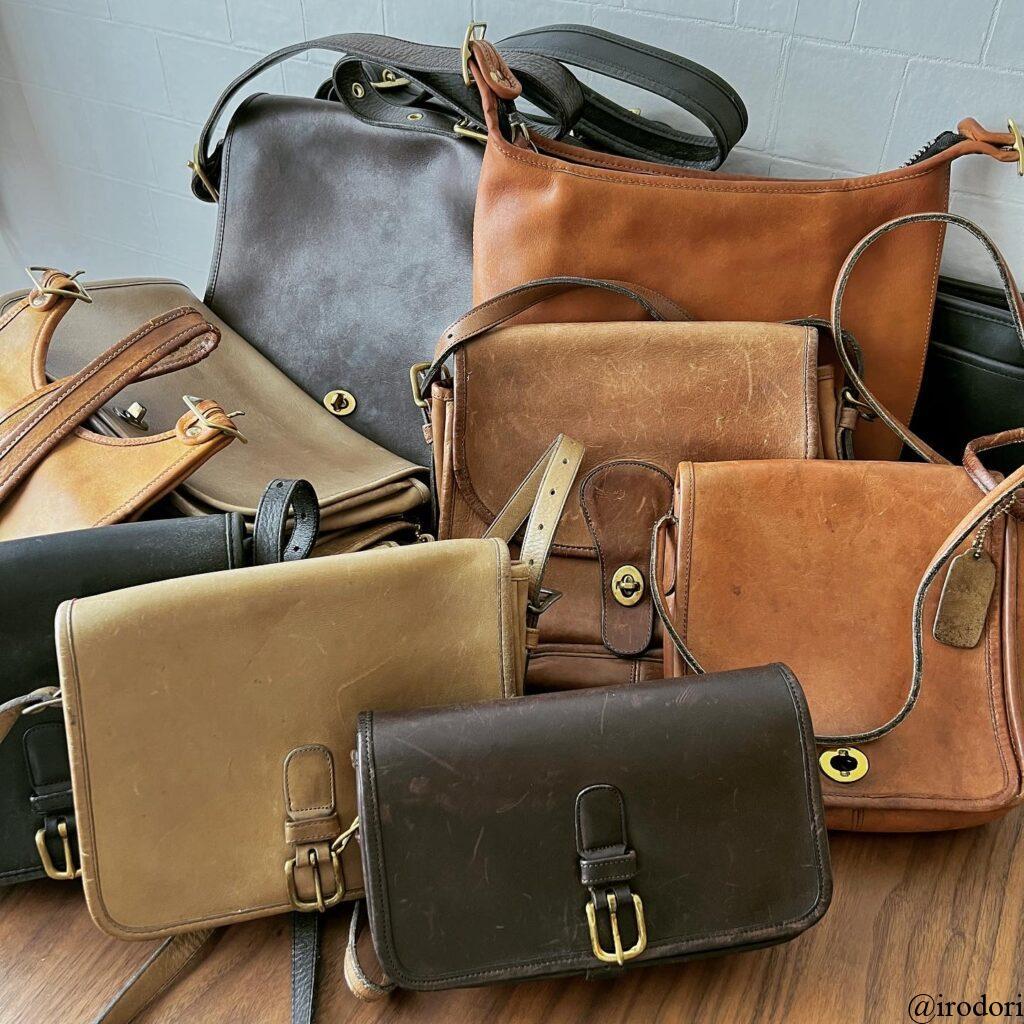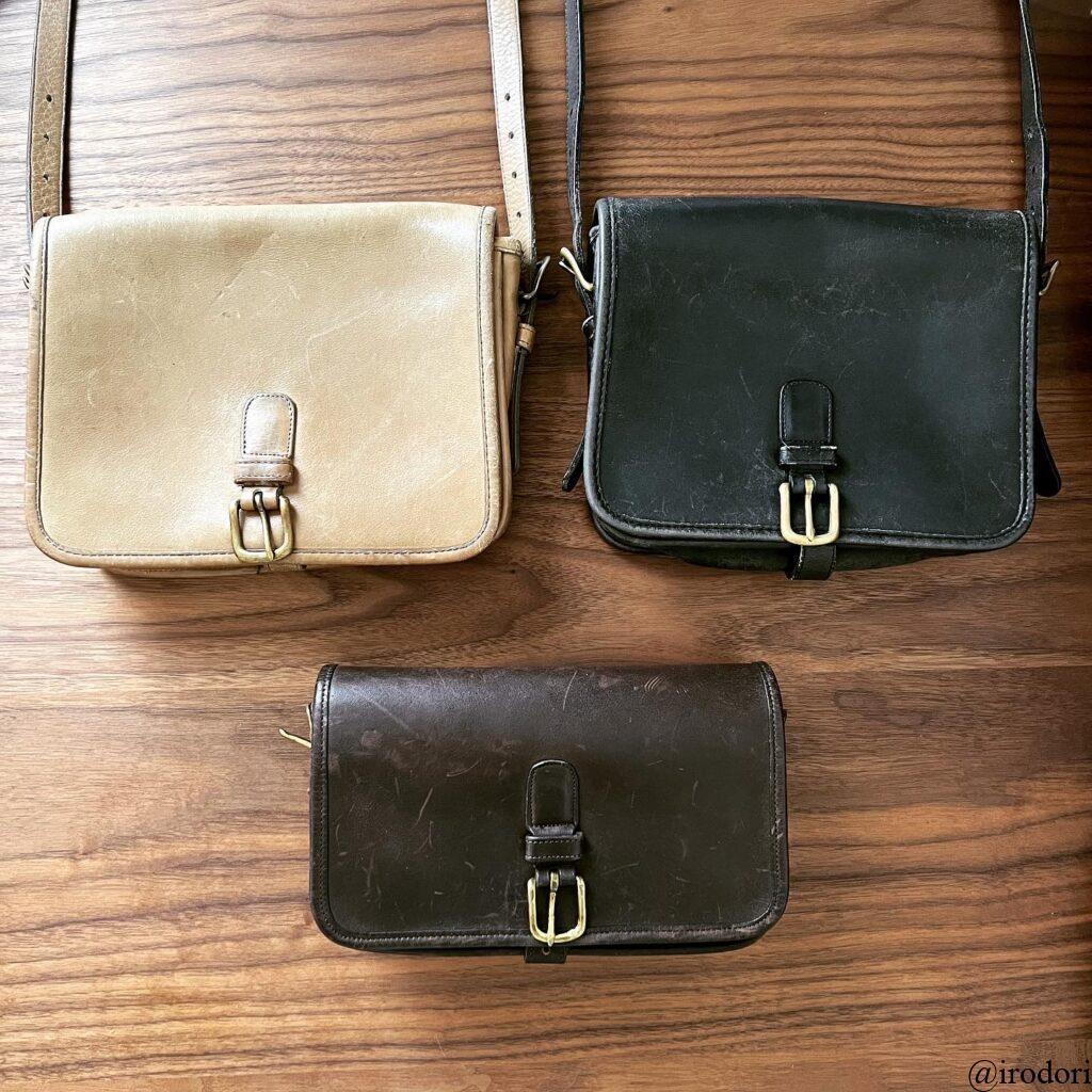 本物の真鍮製サドル金具を使用した、個性的なショルダーポーチ3点セット。3点ともレザーライニングのフラップと内側にジッパー付きコンパートメントを備えています。大きいサイズの2点には、フラップの下にコンパートメントが追加されています。