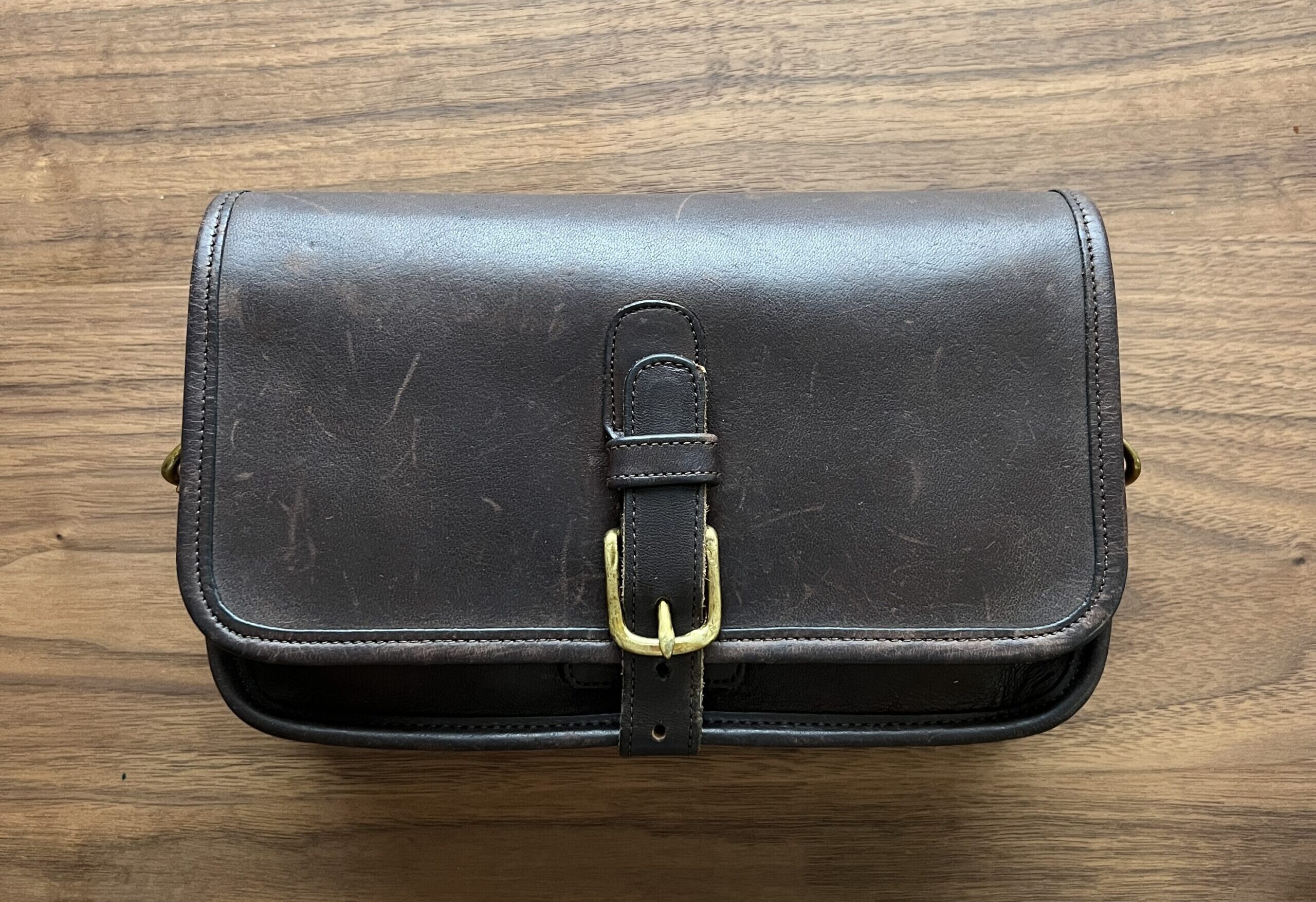 Three-of-a-kind shoulder pouches with authentic solid brass saddlery hardware. All three have leather- lined flap and inside zipper compartment. The two larger sizes have an extra compartment under the flap.