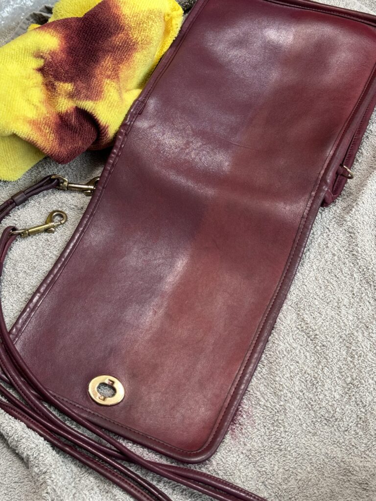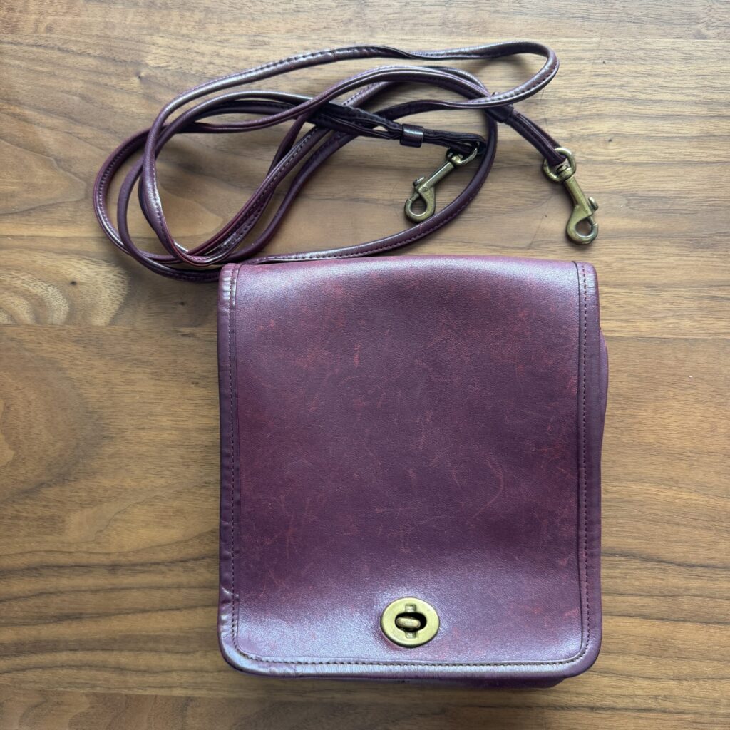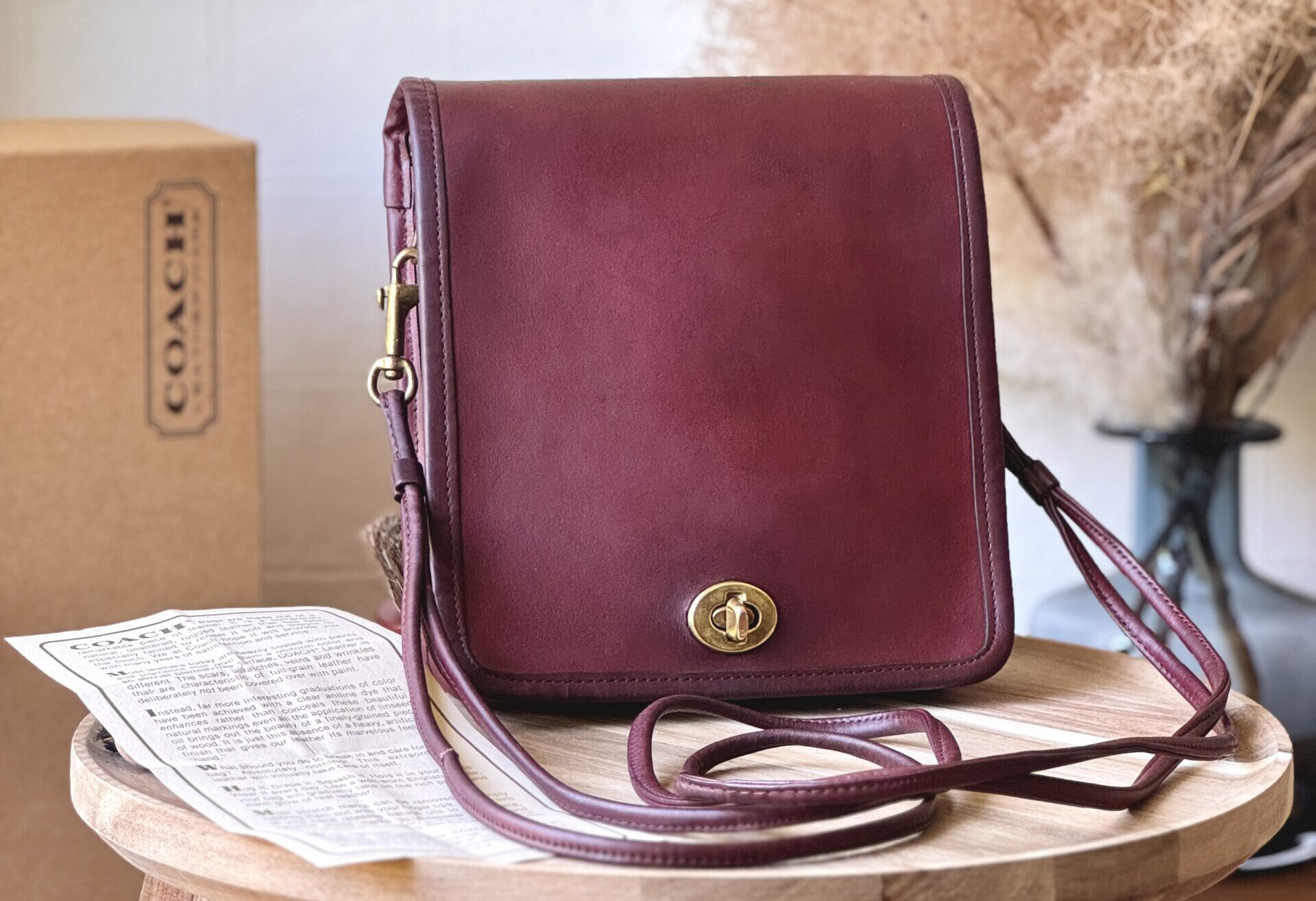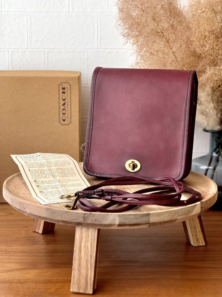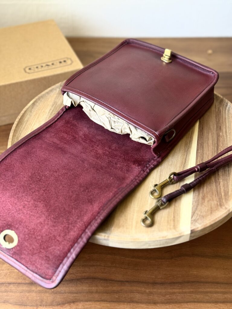 非常にすっきりとしたスクエア型のポーチ。45インチ(約112.5cm)のチューブ状ハンドルが縫い付けられています。内側にはコンパートメントがあり、真鍮製のターンロックが付いています。