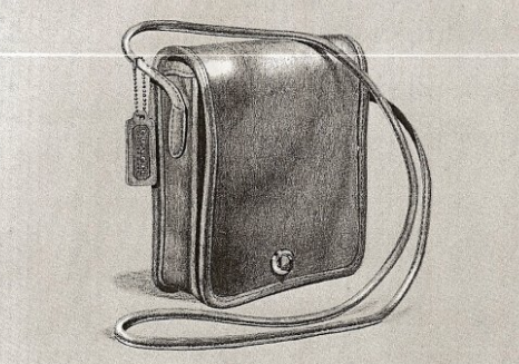 Very trim squared-off pouch with extra-long (45*) one- piece sewn on tubular handle. Inside com- partment. Solid brass turnlock.