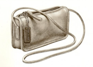 非常にすっきりとしたスクエア型のポーチ。45インチ(約112.5cm)のチューブ状ハンドルが縫い付けられています。内側にはコンパートメントがあり、真鍮製のターンロックが付いています。