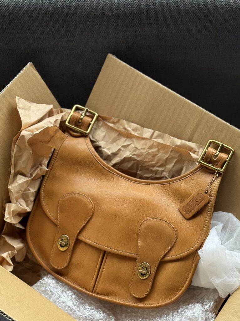 Well-organized pouch keeps everything in its place. Two roomy outside pockets; an extra compartment inside. Solid brass stirrup buckles and turnlocks. Black, Mocha, Tabac, British Tan, Burgundy, Navy.