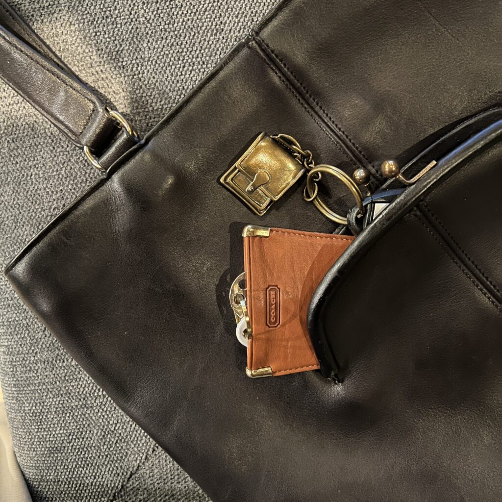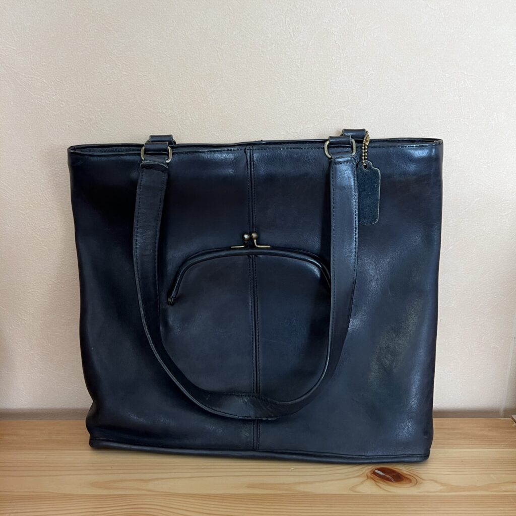 Closed tote with mid-length straps can be carried on or off the shoulder. Outside coin purse si leather-covered; leather- lined. Large extra pocket inside. Brass industrial zipper.