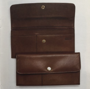 A well-organized envelope with a full length gussetted compartment that holds change without bulking. A separate compartment for bills and two pockets for credit cards and receipts.